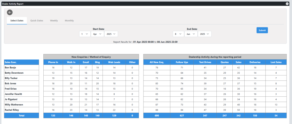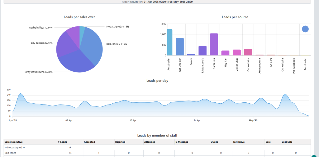 Have a look at just a few example reports we have available. We have reports for customers / enquiries / profit / internet leads / sales staff performance and many more areas.
